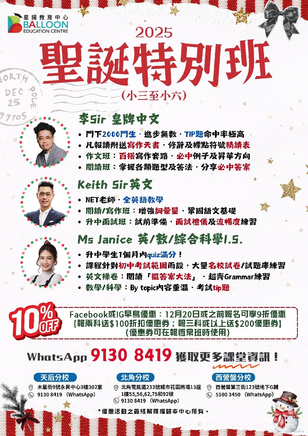 就嚟聖誕節,與其俾小朋友喺屋企打機睇片,不如趁假期幫佢哋打好學科基礎,迎接新一年📚!Balloon聖誕特別班專為小三至小六設計,名師帶住攻破中英數難點!