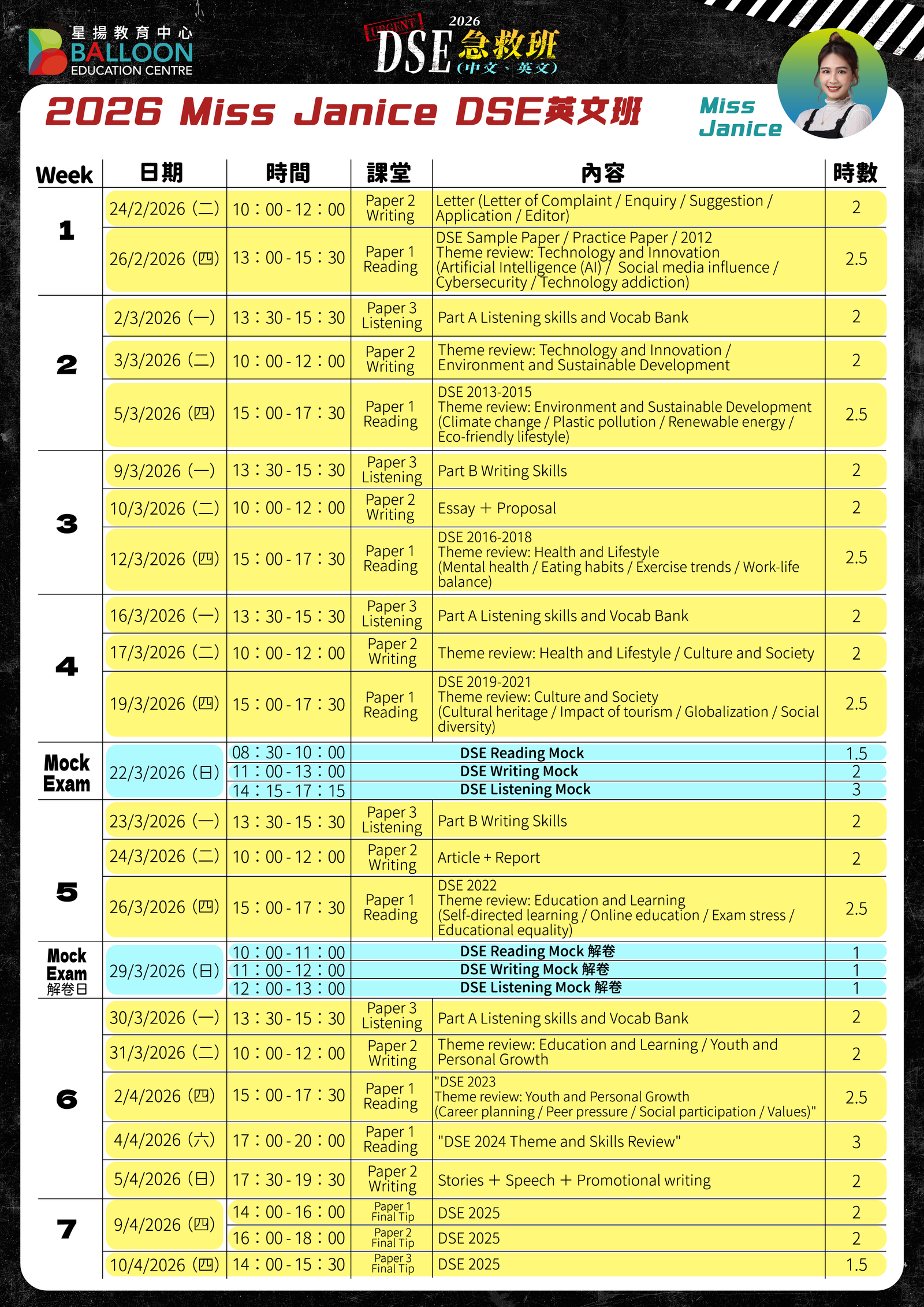 2026 Miss Janice DSE英文班】(天后分校/Zoom)